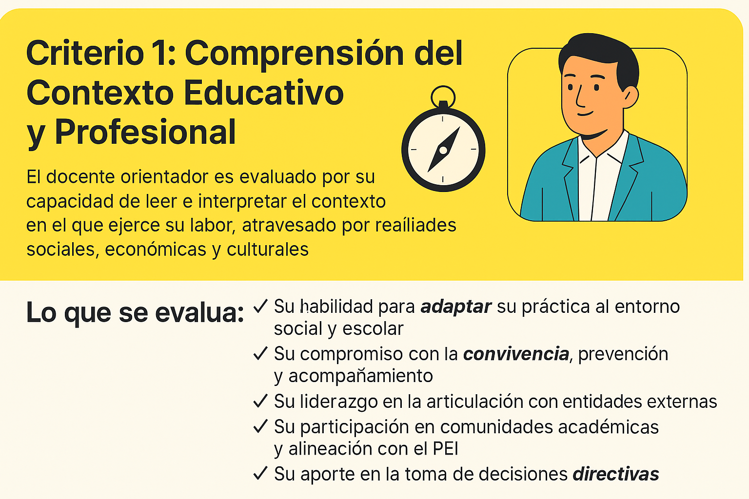 El docente orientador es evaluado por su capacidad de leer e interpretar el contexto en el que ejerce su labor, no solo como espacio físico, sino como un entorno complejo y dinámico atravesado por realidades sociales, económicas y culturales que influyen en la convivencia, el aprendizaje y el desarrollo institucional.
