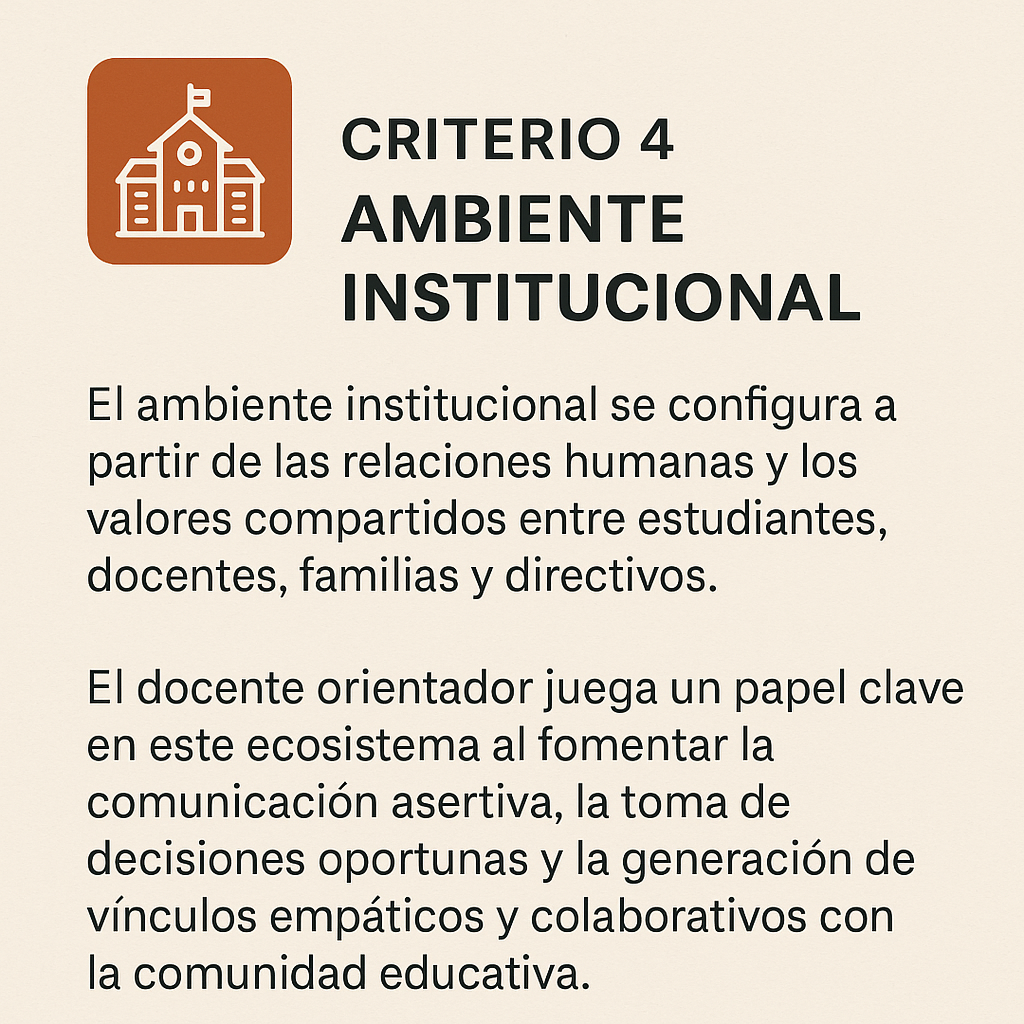 El ambiente institucional se configura a partir de las relaciones humanas y los valores compartidos entre estudiantes, docentes, familias y directivos. El docente orientador juega un papel clave en este ecosistema al fomentar la comunicación asertiva, la toma de decisiones oportunas y la generación de vínculos empáticos y colaborativos con la comunidad educativa.